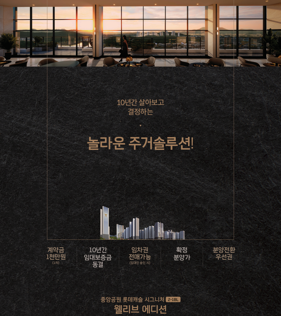개인정보수집에 동의합니다. [내용보기] [개인정보 수집 동의] 1. 수집하는 개인정보 내용 《중앙공원 롯데캐슬》 상담, 문의 신청 등을 위해 아래와 같은 개인 정보를 수집하고 있습니다. - 수집항목 : 이름, 휴대전화번호 - 수집방법 : 대표사이트를 통한 수집(관심고객등록, 방문예약 및 상담) 2. 개인정보의 수집 및 이용방법 《중앙공원 롯데캐슬》 수집한 개인정보를 다음의 목적을 위해 활용합니다. - 분양정보제공, 분양 상담안내, 해당 분양아파트 계약 확인 등 3. 개인정보의 보유 및 이용기간 《중앙공원 롯데캐슬》 개인정보 수집 및 이용목적이 달성된 후에는 해당 정보를 지체 없이 파기합니다. 등록